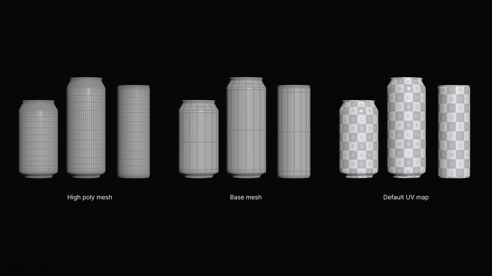 3 soda can 3D models, in base mesh and high poly mesh.